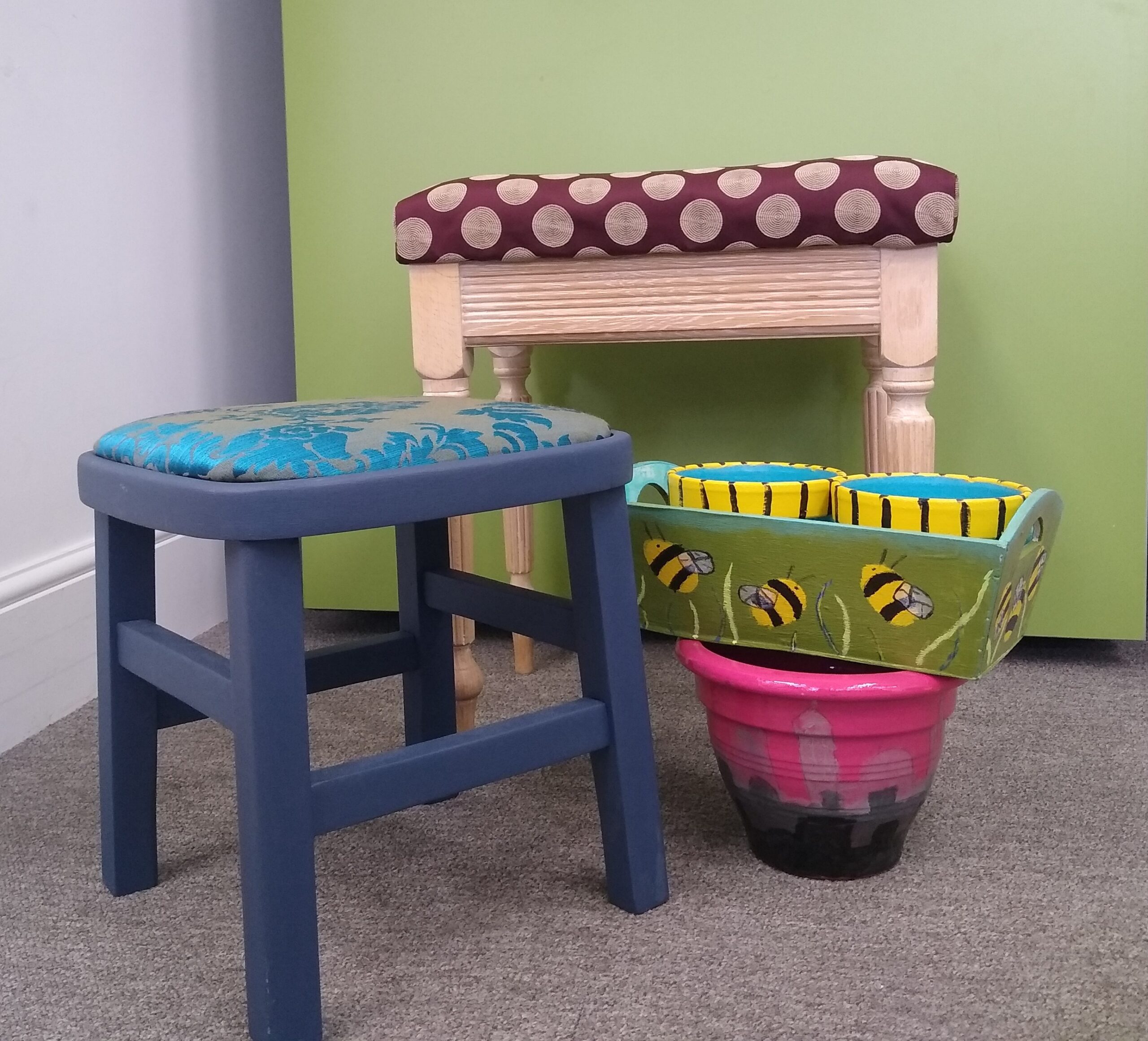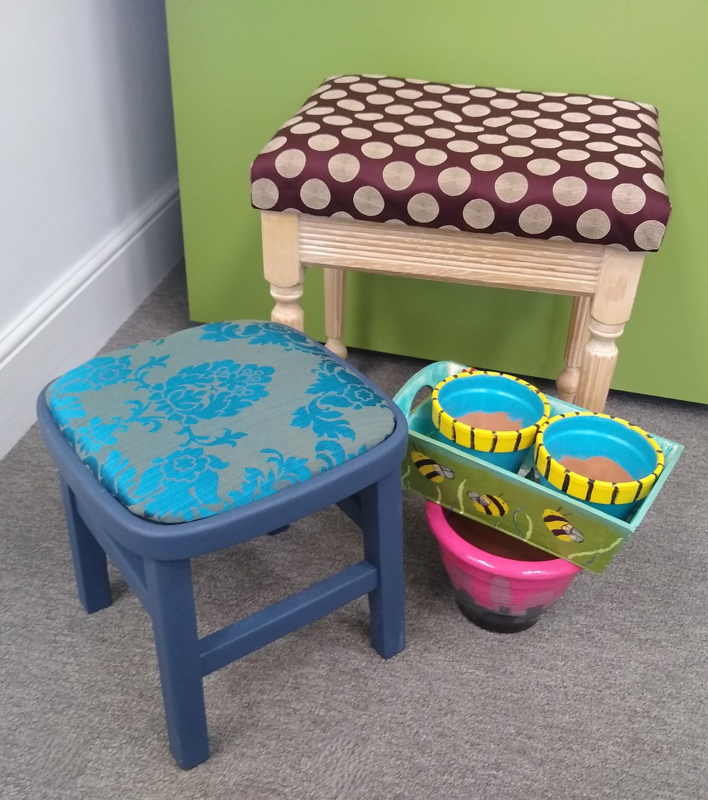 With thanks to the following sponsors we have been able to generate quite a buzz with some of our gardening creations and we’ve upholstered fabulous friendships as we’ve upcycled footstools and the like.